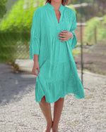 SPECIFICATIONS Style: Casual, Vacation Material: 65%Cotton, 35% Polyester Dress Type: Shift dress Dress Length: Knee Length Neckline: V neck_V Pattern Type: Solid Color Sleeve Type: Regular sleeve Sleeve Length: 3/4 Sleeve Details: Pocket, Drawstring Fit Type: Regular Season: Spring, Summer, Fall Occasion: Daily, Vacation Package Includes: 1...