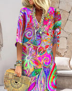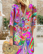 SPECIFICATIONS Style: Casual Material: 5% Spandex, 95% Polyester Dress Type: A-Line Dress Length: Knee Length Neckline: V neck_V Pattern Type: Print Sleeve Type: Flare Sleeve Sleeve Length: 3/4 Sleeve Fit Type: Regular Season: Spring, Summer Occasion: Daily Package Includes: 1 x Dress SIZE TABLE Size Bust Length Sleeve le...