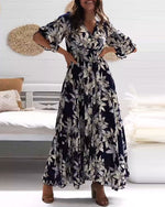 SPECIFICATIONS Style: Casual, Vacation Dress Type: A-Line Dress Length: Maxi Neckline: V neck_V Pattern Type: Print Sleeve Type: Lantern Sleeve Details: Drawstring Fit Type: Regular Material: 95% polyester, 5% spandex Season: Spring, Summer, Fall Occasion: Daily, Vacation Package Includes: 1 x Dress SIZE TABLE (cm) Size Bust Length Sho...