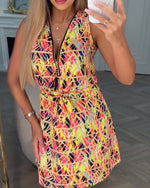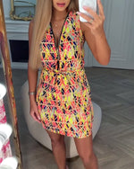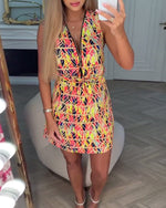 FEATURES Elegant V-neck design: The elegant V-neck design perfectly highlights the charming neck line, adding a touch of elegance and charm to the overall look. Exquisite prints: The unique and exquisite prints are like works of art embellishing the skirt, making you the focus wherever you go, showing your fashion taste. Chic knot details: T...