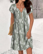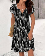 SPECIFICATIONS Style: Casual, Vacation, Chic Material: 5% Spandex, 95% Polyester Dress Type: A-Line Dress Length: Knee Length Neckline: V neck_V Pattern Type: Print Sleeve Type: Regular sleeve Sleeve Length: Short Sleeve Fit Type: Regular Season: Spring, Summer, Fall Occasion: Daily, Vacation Package Includes: 1 x Dress SIZE TABLE ...