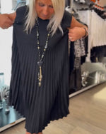 Leaf print slit pleated sleeveless slim fit dress