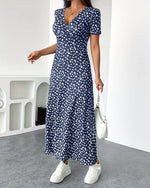 SPECIFICATIONS Style: Elegant Material: Cotton Blends Dress Type: A-Line Dress Length: Maxi Neckline: V neck_V Pattern Type: Leaves Sleeve Type: Puff Sleeve Sleeve Length: Short Sleeve Details: Shirred Fit Type: Regular Season: Spring, Summer Occasion: Daily, Vacation Package Includes: 1 x Dress SIZE TABLE Size US Bust Lengt...
