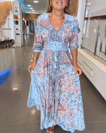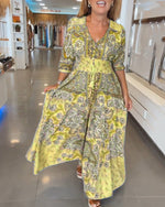 SPECIFICATIONS Style: Casual, Vacation Dress Type: A-Line Dress Length: Maxi Neckline: V neck_V Pattern Type: Print Sleeve Type: Lantern Sleeve Details: Drawstring Fit Type: Regular Material: 95% polyester, 5% spandex Season: Spring, Summer, Fall Occasion: Daily, Vacation Package Includes: 1 x Dress SIZE TABLE (cm) Size Bust Length Sho...