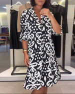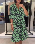 SPECIFICATIONS Style: Casual Material: 5% Spandex, 95% Polyester Dress Type: A-Line Dress Length: Knee Length Neckline: V neck_V Pattern Type: Print Sleeve Type: Flare Sleeve Sleeve Length: 3/4 Sleeve Fit Type: Regular Season: Spring, Summer Occasion: Daily Package Includes: 1 x Dress SIZE TABLE Size Bust Length Sleeve le...