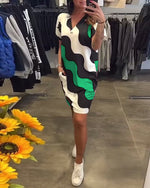 SPECIFICATIONS Style: Casual Material: 5% Spandex, 95% Polyester Dress Type: A-Line Dress Length: Knee Length Neckline: V neck_V Pattern Type: Print Sleeve Type: Flare Sleeve Sleeve Length: 3/4 Sleeve Fit Type: Regular Season: Spring, Summer Occasion: Daily Package Includes: 1 x Dress SIZE TABLE Size Bust Length Sleeve le...