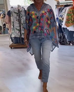 Fake Denim Irregular Print Blouse