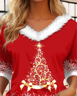 V-Neck Loose-Fitting Christmas Wine Glass Print Top
