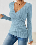 SPECIFICATIONS Top Type: Tops Style: Elegant,Party Material: 95% Polyester 5% Spandex Occasion: Daily,Party Neckline: V neck_V Pattern Type: Solid Color Sleeve Type: Regular sleeve Sleeve Length: Long Sleeve Fit Type: Regular Season: Spring,Fall,Winter Details: Patchwork,Buttons,Shirred Package Includes: 1 x Top SIZE TABLE Size Bust ...
